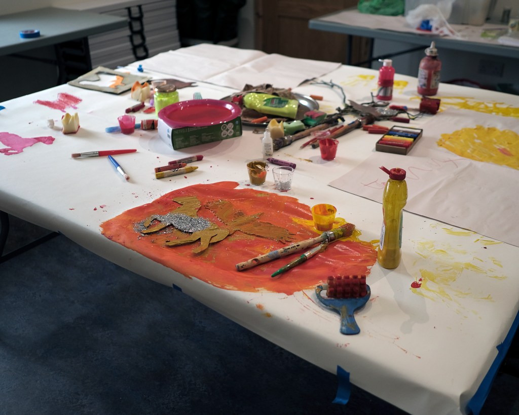 This week’s session was an open play paint and drawing workshop with the two adult non-verbal autistic men. The focus was on exploration rather than outcome — an opportunity to engage with materials freely, without pressure to produce a finished piece.
